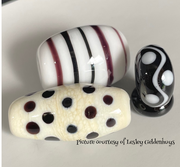Looking at the 3rd photo. The top bead on the left has( from left to right): Effetre black, Effetre intense black, Reichenbach deep black, Lauscha black, Lauscha black. The wriggle dot bead on the right is Lauscha black and Effetre white.