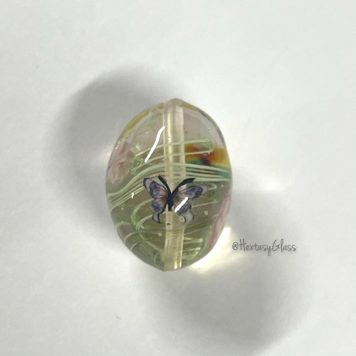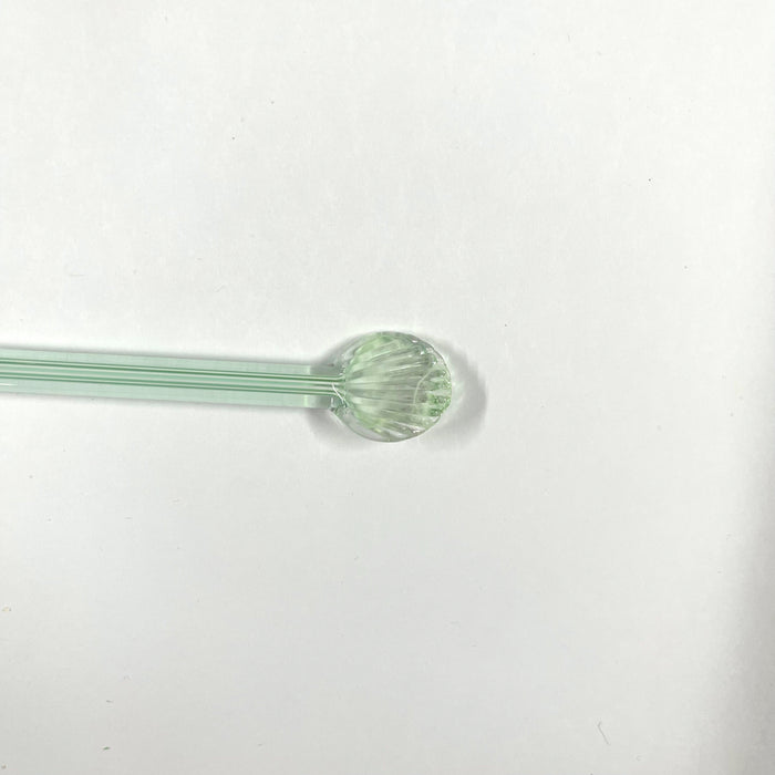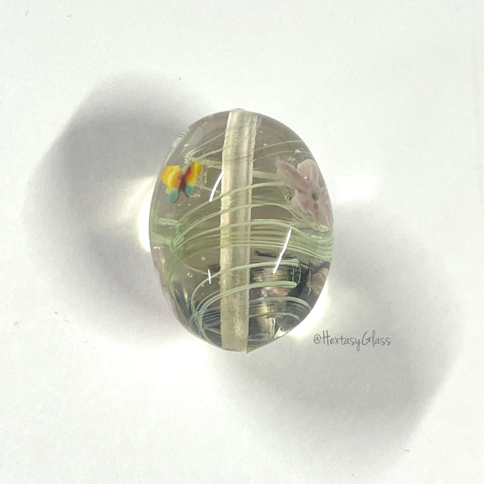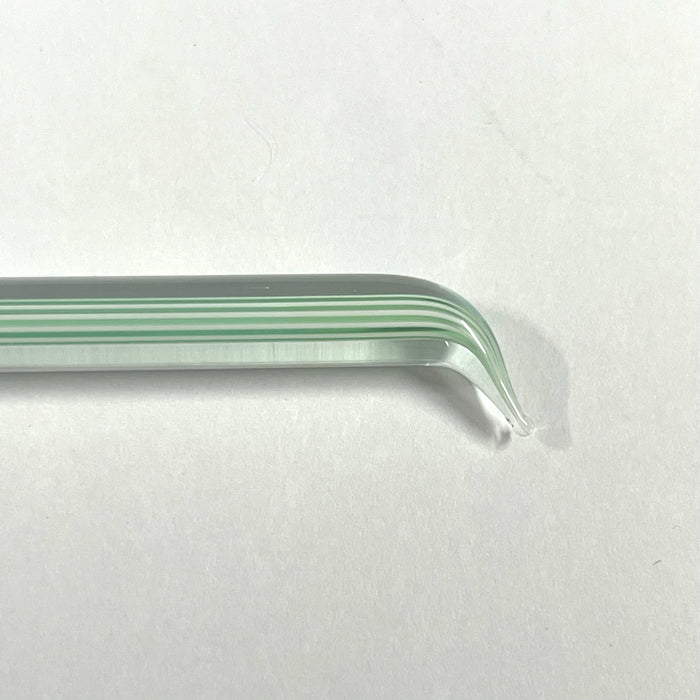 Working notes: This rod has stripes of White and transparent Green in the core and encased in clear. The ends could be cut to make millifiori - great for flower centres or pulled into stringer for vines behind flowers. The amazing lines it gives when spiraled around the core of a bead and it's optical qualities are just crystal clear, no bubbles.