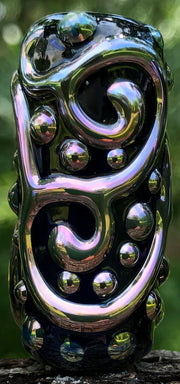 Mirrored silver luster; rotate the bead further out in a reduction flame. Repeat until the desired luster is visible.