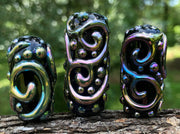 Textured satin; repeatedly pass the bead through the very farthest reaches of the reduction flame without letting the bead get hot again.