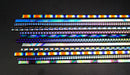 Sizzle Stix are 16-inch (406 mm) strips of dichroic glass cut from thin (2 mm) Bullseye-compatible clear and black glass, pre-fired to round the edges and reduce thermal shock in the flame.