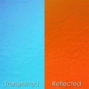 The “Transmitted Colour” is the colour you see in a clear piece of glass when you can actually see through the glass. The “Reflected Colour” is the colour you see in a clear or opaque piece of glass when the light bounces off of the surface of the glass. For example “Cyan/Red” will be Blue in transmission and Red in reflection. If this sheet were put on a black background, you would only see its reflection of Red.