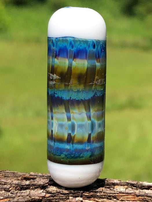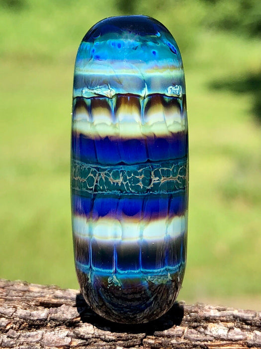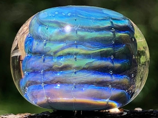Okeanos 2 is a blue striking and reducing colour. Reformulated with the same nucleation system as Terra 3 and Ekho 2, it strikes to a range of blues, greens, purples and amber. It works well on the surface or encased. Super-heating can cause phase separation, resulting in webbing. Okeanos 2 is capable of developing a subtle luster and retaining that luster under clear encasement.
