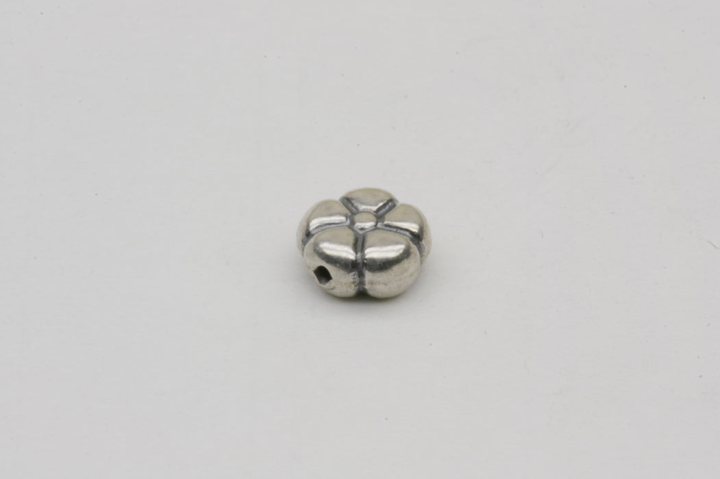 Measuring 7.5x7.5x3 mm, its intricate floral design exudes timeless elegance. The bead features a 1mm hole diameter, making it an ideal addition for bracelets or necklaces.