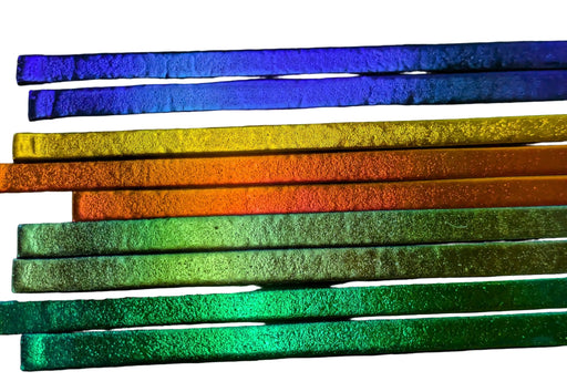 View full detailsSizzle Stix are 406 mm strips of dichroic glass cut from thin (2 mm) Bullseye-compatible clear glass, pre-fired to round the edges and reduce therm...