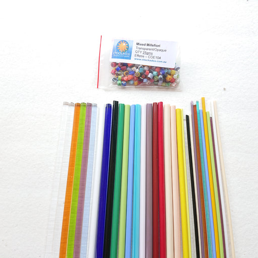 View full detailsThis includes: 20 Rods (33-35cm) 12 Stringer (33-35cm) Millefiori (25g) Colour range is from the Effetre glass (COE104). The colours included in ...