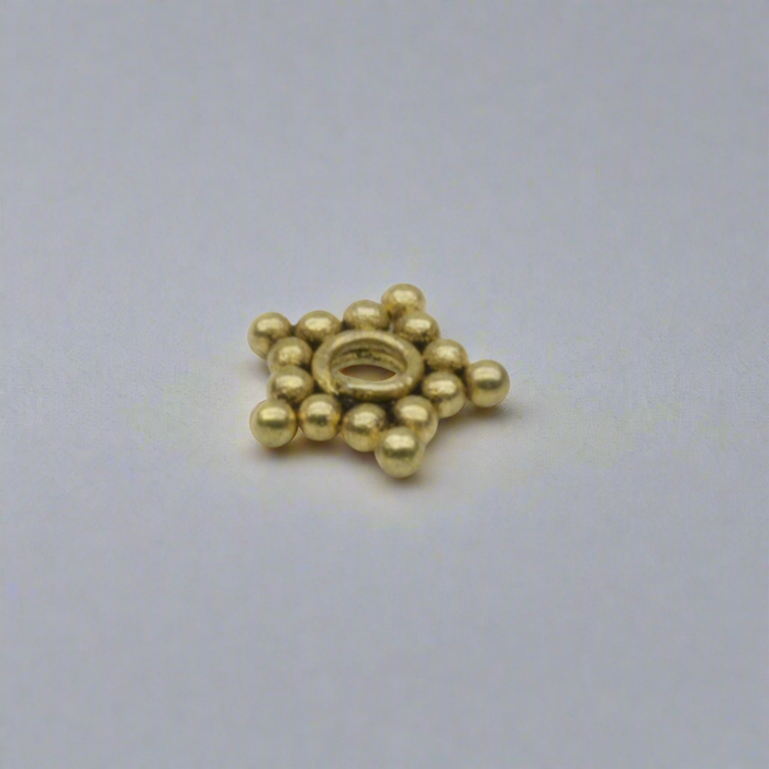 Add a touch of elegance to your jewellery creations with the Golden Starlight Spacer Bead. Crafted from premium Antique Vermeil (24k Gold Plated over Sterling Silver), this spacer features a brilliant golden finish that exudes sophistication. Measuring 6x6x1.5 mm with a 1 mm hole diameter, it is perfect for threading onto fine chains, bracelets, or earrings.