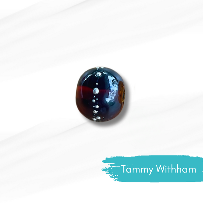 Though listed as opaque, Tammy Withham found this glass behaves more like a transparent. It handles heat beautifully ā no bubbling or pitting ā and stays very dark, appearing almost black in natural light. When paired with an ivory band and another layer of Topaz, the rich brown-gold colour really pops.