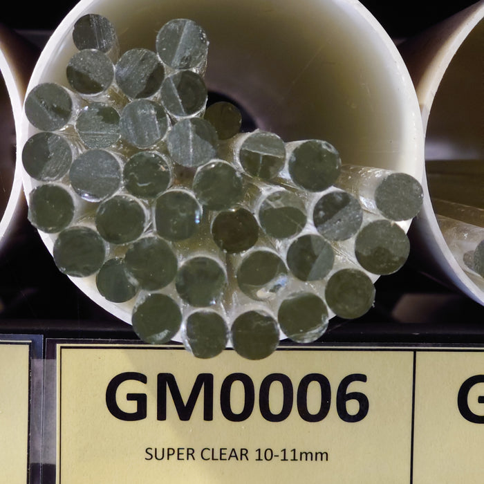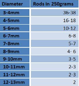 The following is a guide only for the number of rods in 250 grams based on the diameter of the glass. Its variable due to the length of glass in a batch resulting in a rod being between 30cm - 35cm in length.