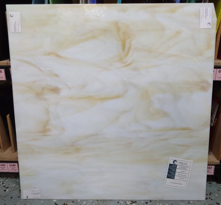 White/Pale Amber Smooth Fusible offers luminous amber windows peaking through streaks of opal in a semi-translucent glass sheet.